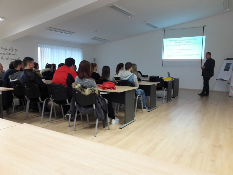 Prokurist Poduzetničkog inkubatora Bojan Mijok predstavio im je Poduzetnički Inkubator kao poduzetničku potpornu instituciju te sve usluge koje pruža poduzetnicima početnicima prilikom njihovog ulaska u poduzetništvo. Predstavljen je projekt „Mreža poduzetničkih inkubatora“ koji se trenutno provodi, a čijim završetkom će se otvoriti još tri takva inkubatora na području Virovitičko podravske županije. Studenti su imali prigodu obići stanare inkubatora, razgovarati s njima, vidjeti dio njihovog poslovanja i čuti iskustva koja oni imaju sa Poduzetničkim inkubatorom. Nakon toga, studenti su obišli Panonski drvni centar kompetencija te su se imali priliku upoznati sa radom ove poduzetničke potporne institucije i njezinim uslugama.