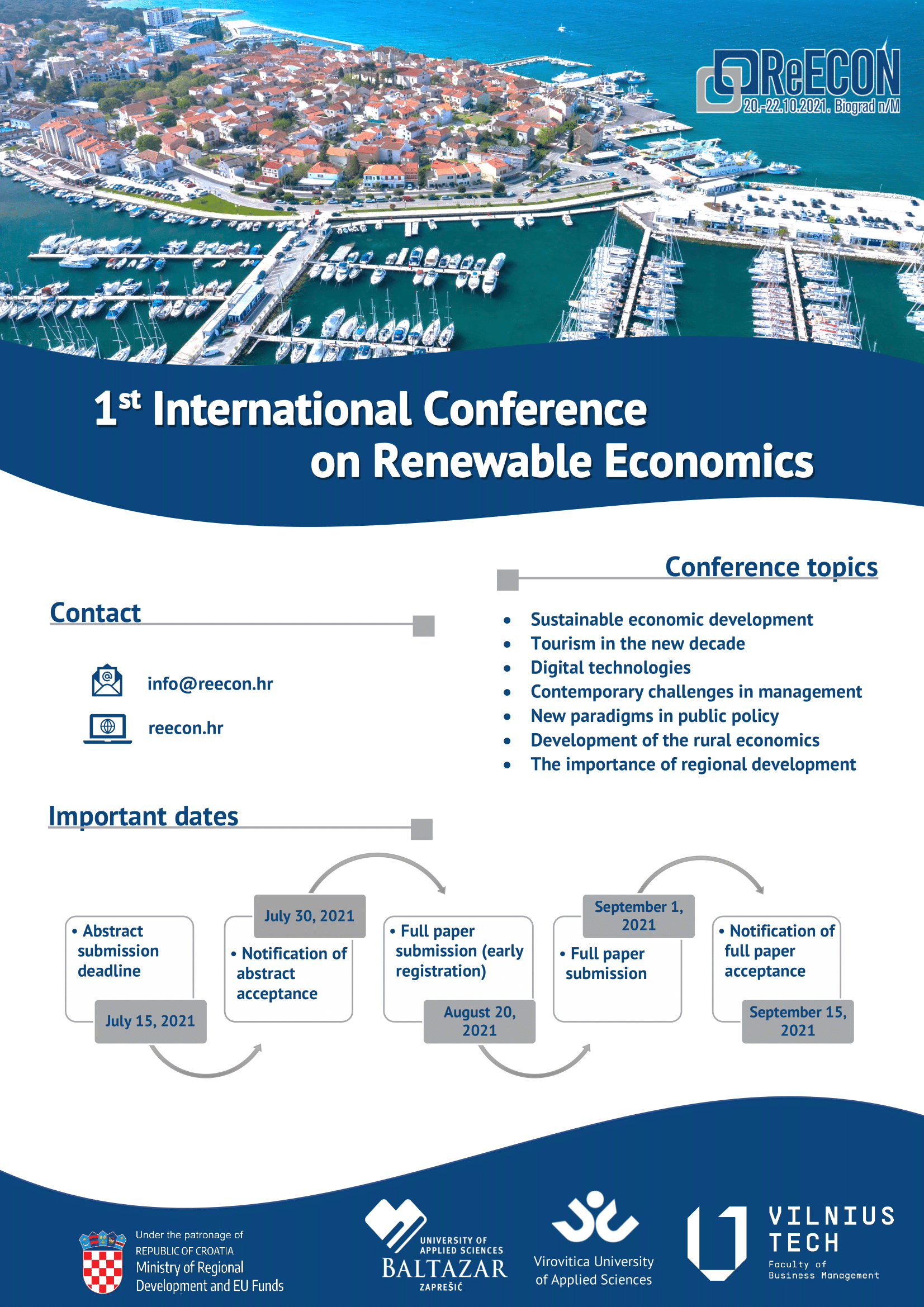 Veleučilište u Virovitici u suradnji s Veleučilištem Baltazar Zaprešić i Faculty of Business Management iz Litve organizira prvu znanstveno-stručnu konferenciju “International Conference on Renewable Economics – ReECON” koja će se održati u Biogradu na Moru od 20. do 22. listopada 2021. godine.