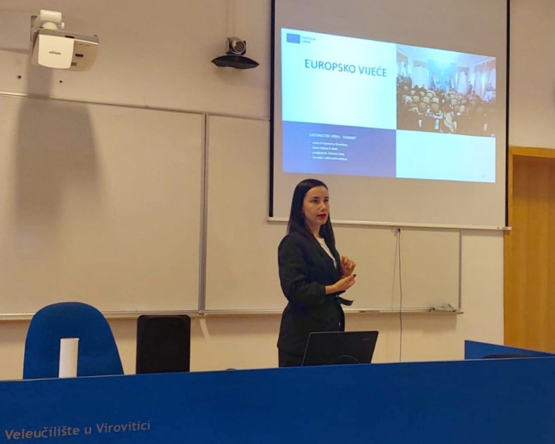 U okviru predavanja osvrnula se na važnost kvalitetne i pravovremene komunikacije između građana i europskih institucija, naglasivši kako bolje razumijevanje procesa donošenja odluka potiče veću uključenost mladih u europske politike. Sudionicima je predstavila praktične primjere iz rada u uredu zastupnice u Europskom parlamentu, a kroz osobna iskustva pojasnila je i širok raspon poslova koje obavljaju asistenti. Na kraju je studentima pružila vrijedne savjete o mogućnostima stručne prakse, stipendija i stažiranja u institucijama Europske unije.