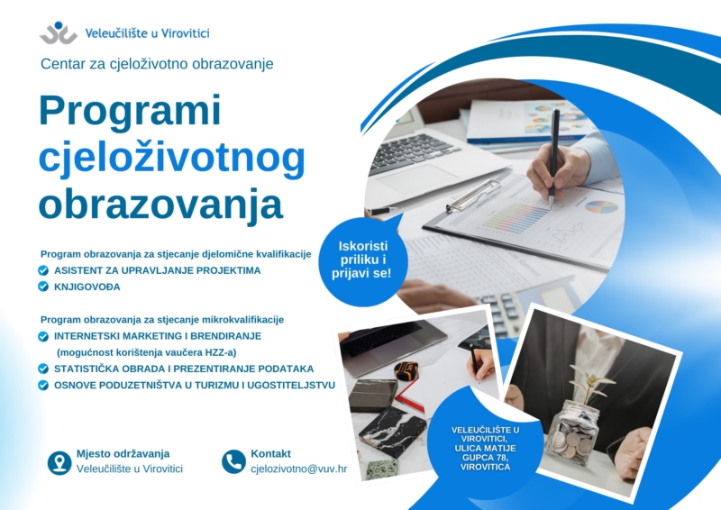 Veleučilište u Virovitici organizira i izvodi programe cjeloživotnog obrazovanja koji su namijenjeni svima onima koji žele steći nova znanja i vještine. U ponudi je ukupno pet programa cjeloživotnog obrazovanja: Asistent za upravljanje projektima, Statistička obrada i prezentiranje podataka, Knjigovođa, Osnove poduzetništva u turizmu i ugostiteljstvu te program Internetski marketing i brendiranje koji je sufinanciran putem vaučera HZZ-a. Svi programi su akreditirani od Agencije za strukovno obrazovanje i obrazovanje odraslih te se svakom polazniku nakon uspješno završene provjere izdaje Uvjerenje o osposobljavanju. Za sve dodatne informacije možete se javiti na broj telefona 033/492-265 ili na e-mail cjelozivotno@vuv.hr
