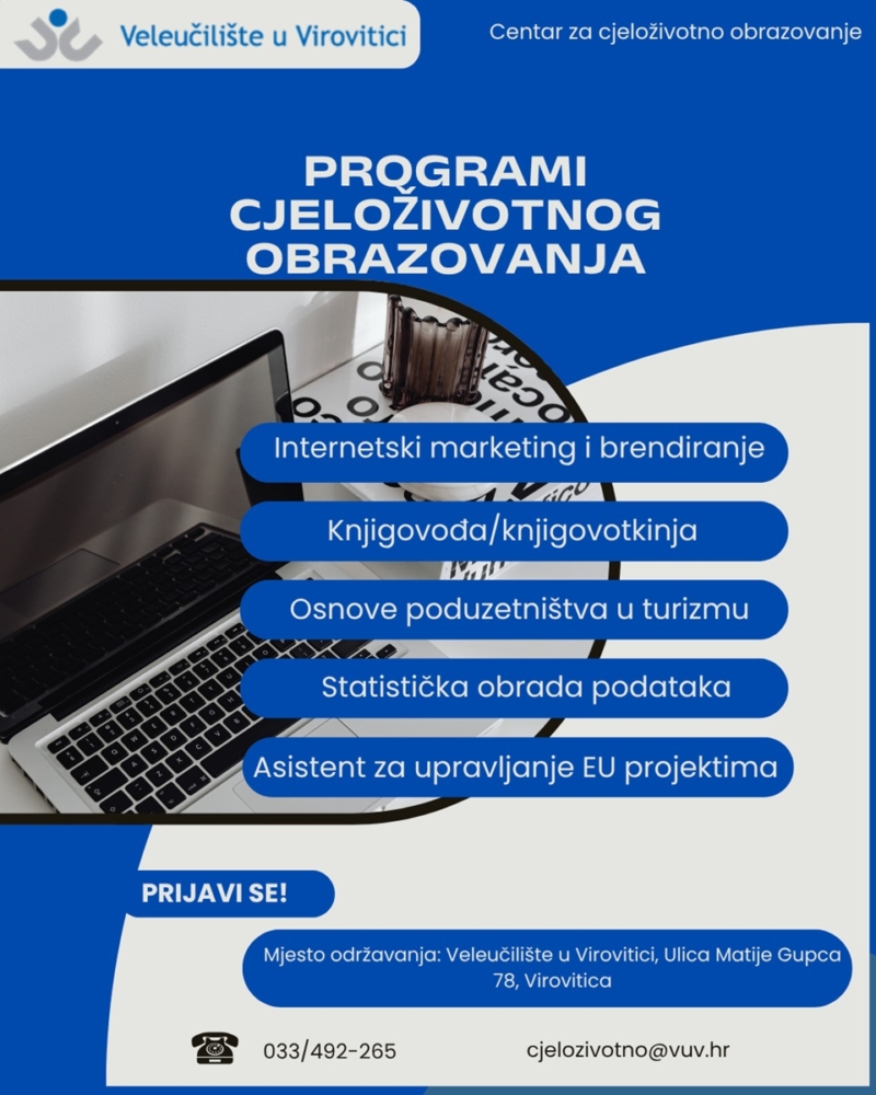 Veleučilište u Virovitici organizira i izvodi programe cjeloživotnog obrazovanja koji su namijenjeni svima onima koji žele steći nova znanja i vještine. U ponudi je pet programa cjeloživotnog obrazovanja: Asistent za upravljanje projektima, Statistička obrada i prezentiranje podataka, Knjigovođa, Osnove poduzetništva u turizmu i ugostiteljstvu kao i program Internetski marketing i brendiranje koji je financiran putem vaučera HZZ-a te je za polaznike u potpunosti besplatan. Svi programi su akreditirani od Agencije za strukovno obrazovanje i obrazovanje odraslih te se svakom polazniku nakon uspješno završene provjere izdaje Uvjerenje o osposobljavanju. Za sve dodatne informacije možete se javiti na broj telefona 033/492-265 ili na e-mail cjelozivotno@vuv.hr